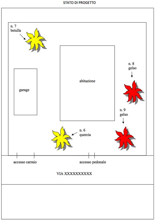 4. la piantumazione di n. 2 nuove alberature di gelso, da posizionare come da progetto allegato (i 2 alberi sono evidenziati in rosso e identificati con i numeri 8 e 9 nella planimetria allegata).