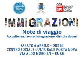 Sabato 6 aprile, alle ore 10, al Centro Sociale Culturale Porta Nova in via Aldo Moro 2/1 a Russi, si terrà l'incontro-dibattito dal titolo «Note di viaggio. Accoglienza, lavoro, integrazione, diritti e doveri», organizzato dal Comune, in collaborazione con lo SPI-CGIL di Russi. Si tratta di un'occasione di confronto e conoscenza per approfondire il tema delle immigrazioni, attraverso i concetti di accoglienza e inclusione e attraverso le testimonianze di chi, tra mille difficoltà, ha affrontato un lungo viaggio per cercare una vita migliore.