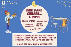 «Dire, Fare, Creare» è la nuova iniziativa promossa dal Comune di Russi in collaborazione con i titolari degli esercizi commerciali per invitare i russiani a trascorrere le sere estive nel cuore della città, all'insegna dello shopping e del divertimento. Per tre lunedì, dalle ore 18.30 fino a mezzanotte, il programma prevede negozi aperti, laboratori, degustazioni, dimostrazioni, esposizioni, mercatini, musica dal vivo e tante altre proposte di svago per grandi e piccini. Il 17 giugno e 15 luglio 2024 i riflettori si accenderanno sul centro (Piazza Farini, Piazza Dante, Corso Farini ecc...), mentre il 1 luglio la scena si sposterà al Centro commerciale I Portici, in via Godo Vecchia.